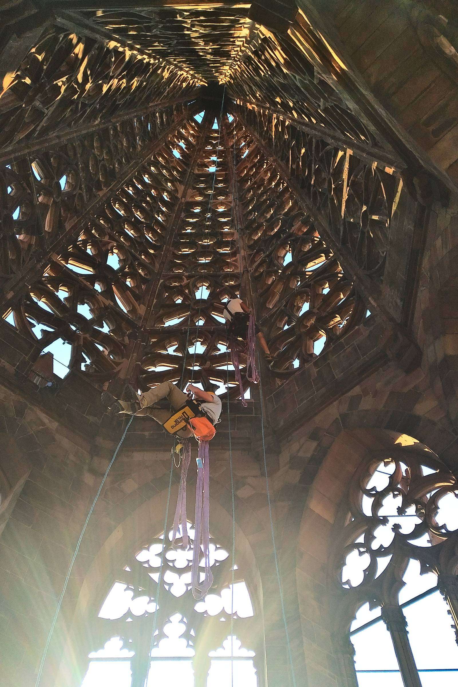 Technisch auch kein ganz simpler Job, mit 800 Meter Seil, rauhem Sandstein, vielen Ecken und Kanten und Nasen der Wasserspeier, die abbrechen könnten.
